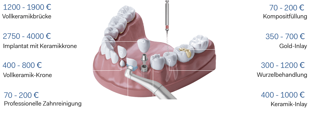 Kronen, Brücken, Verblendungen, Veneers, Inlays, Onlays, Implantate (inkl. Knochenaufbau), Funktionsanalyse und Funktionstherapie) verursachen den größten Teil an den Gesamtkosten beim Zahnarzt.